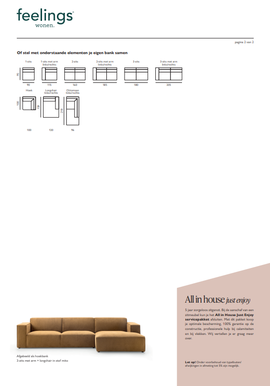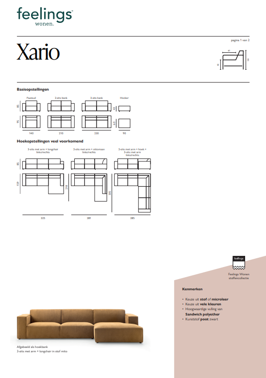 De Xario Hoekbank stel je volledig samen op basis van jouw woonwensen. Met verschillende elementen bepaal je zelf de ideale opstelling voor jouw interieur. Je kiest uit de volledige Feelings Wonen stoffencollectie, met een brede selectie aan stoffen en kleuren. Zo geef je Xario precies de uitstraling die past bij jouw stijl, terwijl je geniet van een comfortabele en tijdloze basis in je woonkamer.